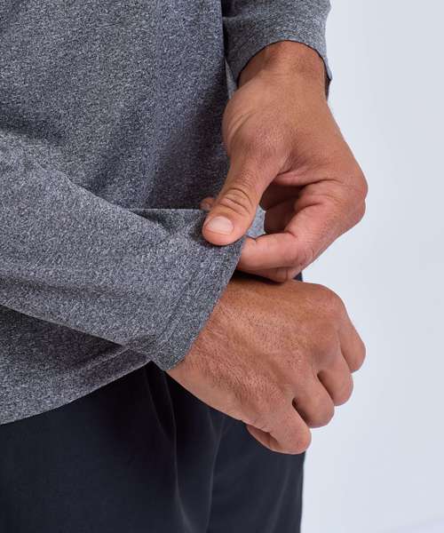Contrast ΒΌ zip. Long sleeves. Stretch. Twin-needle stitching. Wicking fabric. We recommend using block out vinyl and inks.Product contains no branded neck or waist label. Removable Kimble or looped garment tags. Inner seam label holds important product information on one label with a second label containing brand information which can be cut-away. UPF 40+.